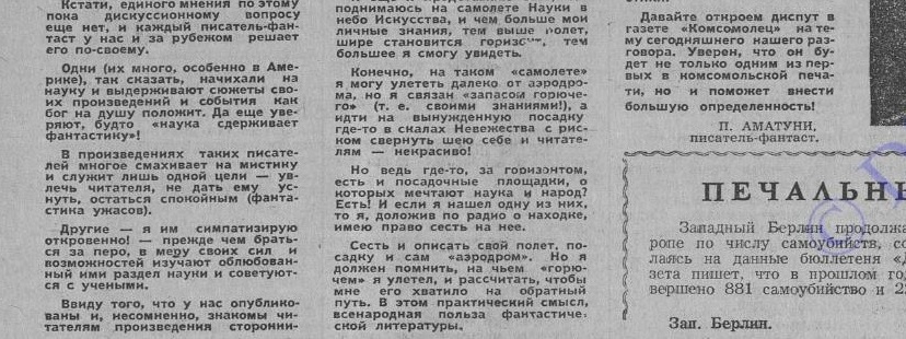 Вариант этой же статьи (совпадает примерно на 85%) был опубликован ЖУРАВЛЕВОЙ в газете «Правда Севера» 19 июня 1966 года под названием «Горизонты фантастики». Возможно, эти же «Горизонты фантастики» повторены в 7-м номере «Литературного Азербайджана» 1966 года. Некоторые тезисы статьи из «Комсомольца» были также использованы в выступлении «Трудности роста» в сборнике «О литературе для детей. Выпуск 10» 1965 года.