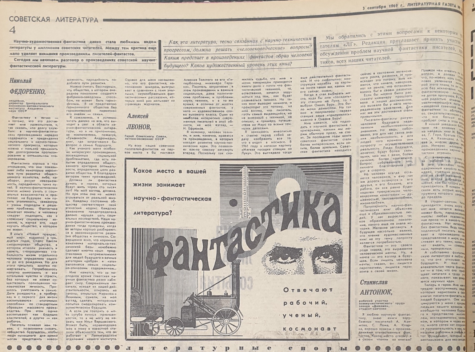 Дискуссию о научной фантастике, начатую 3 сентября 1969 года статьей Игоря БЕСТУЖЕВА-ЛАДЫ и выступлениями Николая ФЕДОРЕНКО, Алексея ЛЕОНОВА и Станислава АНТОНЮКА продолжили читатели. Этой подборки в сети в открытом доступе нет.