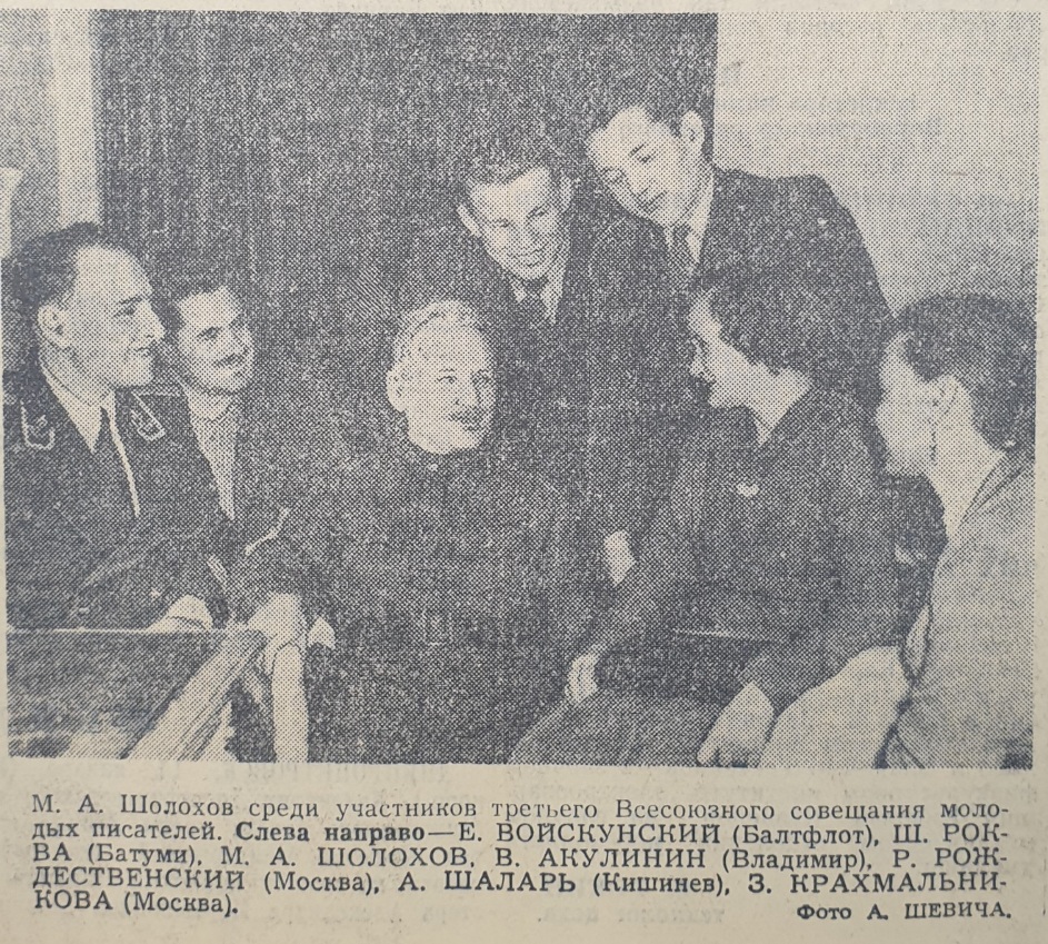 — Главный советский классик Михаил ШОЛОХОВ... появился в кулуарах совещания... Фотограф из «Комсомольской правды», упросил ШОЛОХОВА сесть в кресло и расположил вокруг него нескольких участников совещания. Я был в морской форме, и, может, поэтому фоторепортер позвал меня. Предложил всем улыбаться. Так мы и появились на странице «Комсомолки» — ШОЛОХОВ, четверо вьюношей (в том числе Роберт РОЖДЕСТВЕНСКИЙ и я) и две девицы. Мы все улыбаемся.