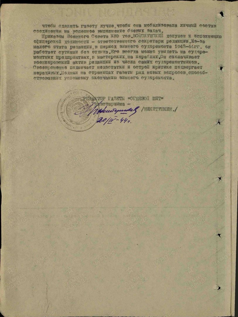 Евгений ВОЙСКУНСКИЙ, в то время корреспондент многотиражки «Красный Гангут», был вывезен с полуострова последним, десятым отрядом уже в декабре на турбоэлектроходе «Иосиф Сталин», который тоже подорвался на мине и потерял управление. На «Иосифе Сталине» было более пяти тысяч человек и только часть из них сумела перепрыгнуть на подходящие вплотную тральщики (среди них оказался и ВОЙСКУНСКИЙ), часть погибла, а часть была взята в плен с дрейфующего турбоэлектрохода.