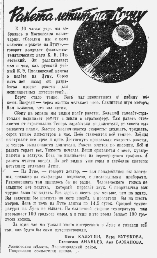 Петя Калугин, Вера Бурякова, Станислав Ананьев, Аня Бажанова. Ракета летит на Луну (заметка об экскурсии в планетарий) // Пионерская правда. — 1948. — 3 января (№ 1). – С. 3.