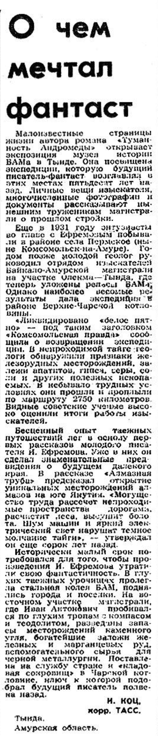 Коц, И. О чём мечтал фантаст : [Инф. корр. ТАСС, г. Тында, Амурская обл. о работе И. Ефремова на БАМе в 1934 г.] // Тихоокеанская звезда (Хабаровск). — 1984. — 8 июля.