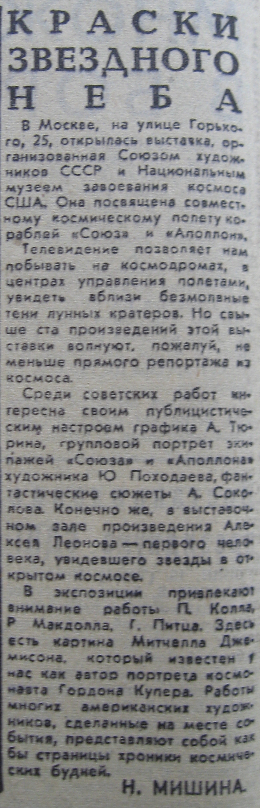 Н. Мишина. Краски звёздного неба // Правда. — 1975. – 16 июля (№ 197). – Первый выпуск. — С. 3.