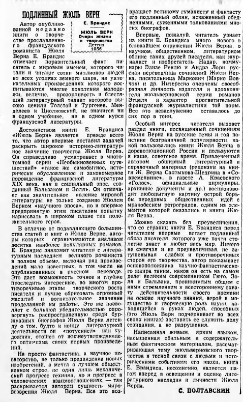 Написанная живым, ярким языком, насыщенная обильным и содержательным фактическим материалом, рассматривающая тему жюльверновского творчества в тесной связи с людьми и историческими событиями его эпохи, книга Е. Брандиса, несомненно, является шагом вперед в освещении и оценке литературного наследии и личности Жюля Верна.
