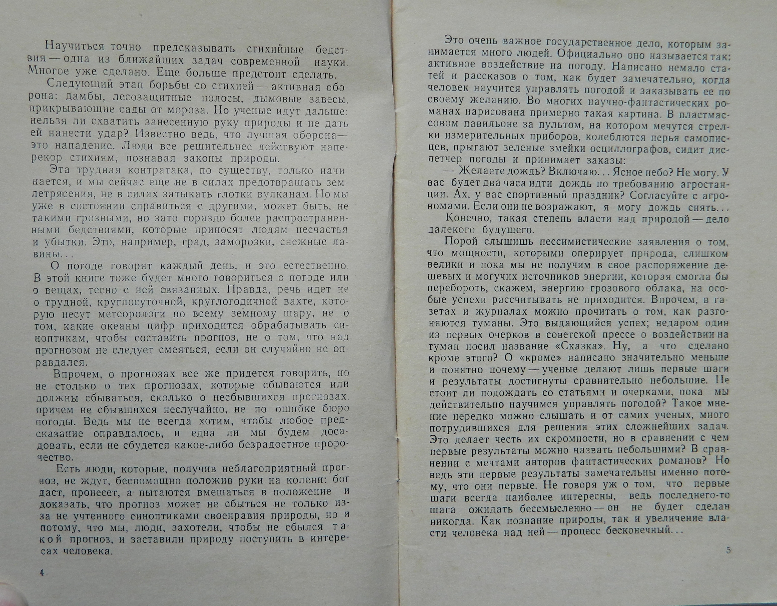 Порой слышишь пессимистические заявления о том, что мощности, которыми оперирует природа, слишком велики и пока мы не получим в свое распоряжение дешевых и могучих источников энергии, которая смогла бы перебороть, скажем, энергию грозового облака, на особые успехи рассчитывать не приходится. Впрочем, в газетах и журналах можно прочитать о том, как разгоняются туманы. Это выдающийся успех; недаром один из первых очерков в советской прессе о воздействии на туман носил название «Сказка». Ну, а что сделано кроме этого? О «кроме» написано значительно меньше и понятно почему — ученые делают лишь первые шаги и результаты достигнуты сравнительно небольшие. Не стоит ли подождать со статьями и очерками, пока мы действительно научимся управлять погодой? Такое мнение нередко можно слышать и от самих ученых, много потрудившихся для решения этих сложнейших задач. Это делает честь их скромности, но в сравнении с чем первые результаты можно назвать небольшими? В сравнении с мечтами авторов фантастических романов? Но ведь эти первые результаты замечательны именно потому, что они первые. Не говоря уж о том, что первые шаги всегда наиболее интересны, ведь последнего то шага ожидать бессмысленно — он не будет сделан никогда. Как познание природы, так и увеличение власти человека над ней — процесс бесконечный...