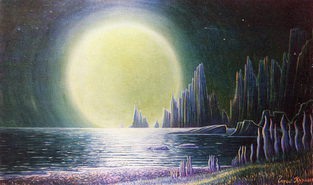 Всегда меня удивляла на 10-й стр. вклейки репродукция "Планета Зеленого Солнца. Восход". Картина представлена развёрнутой на 180 градусов по горизонтали и... на стульях! Усечённое изображение из-за ошибки фотографа. В издательстве и в типографии тоже проглядели казус с данной иллюстрацией.