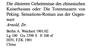 В начале 20 века был довольно популярен роман в выпусках о "китайском дворе" некоего Арнольда или, как его еще именовали, доктора Арнольда. Вот какие мне удалось найти сведения. Самое известное издание было под названием "Страшные тайны Китайского двора" в 1905 году в Варшаве (изд. Мерецкого?) — на русском языке. Параллельно было издание в Петербурге под названием "Тайны китайского двора", в 1904-1905 гг. — в выпусках, в 1905 г. — как минимум было два тома в качестве Приложения к «Свету», в 1908 г. — еще одно книжное издание, автор указан как доктор Арнольд. Также мне встречалось упоминание издания "Черные тайны китайского двора", но я понятия не имею, где оно выходило. Учитывая, что никто в глаза не видел других изданий, исследователи долгое время считали, что доктор Арнольд — это псевдоним русского автора или, скорее, группы авторов, выпустивших под ним роман в 1904-1905 гг. Однако я с этой точкой зрения не согласен в свете статьи, опубликованной в журнале "Огонек" (приложение к "Биржевым ведомостям") №45 за 1900 год. Статья называется "Немецкие романы о Китае" Л.А., проживающей (ем) в Берлине, в ней рассматриваются самые популярные в то время в Германии (!) романы немецких авторов (!!) о Китае, романы, которые "во всех деревушках читают" (!!!). В том числе "Мрачные тайны китайского двора, или стены мертвых в Пекине" Арнольда!!! Из этого я делаю вывод, что загадочный доктор Арнольд — немецкий автор, и язык оригинала — немецкий, причем роман впервые был опубликован в 1900 году или ранее. К сожалению, в настоящий момент оригинал на немецком мне найти не удалось, да и это не удивительно, учитывая общую ситуацию в Германии в 1920-1940-х годах. И всё же сам я не сомневаюсь: "Тайны..." написаны именно немецким писателем, соответственно, на немецком языке, а русские издания представляют собой перевод. Сергей Неграш P.S. Коллега Walles только что прислал дополнение к моему посту — информацию по немецкому изданию 1901-1902 гг.: