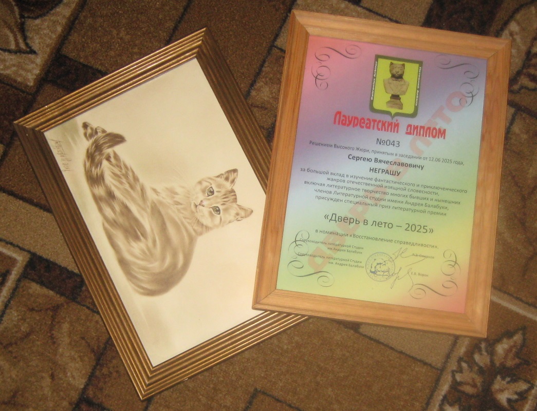 Сегодня мне на Литературной студии им. А.Д. Балабухи торжественно вручили премию "Дверь в лето-2025" в номинации "Восстановление справедливости" "за большой вклад в изучение фантастического и приключенческого жанров отечественной изящной словесности..." К диплому прилагается подарок — мне досталась картина О. Патрушевой, а Ю. Гаврюченкову — Ю. Андреевой.