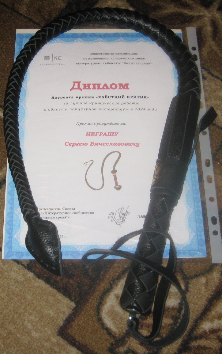 Вчера, 14.11.2025, в Шолоховском зале Союза писателей России (Москва, Комсомольский проспект, 13) прошло заседание Совета по фантастической и приключенческой литературе СПР. Вначале обсуждали разные дела, потом была церемония награждения лауреатов этого года. Мне дали премию "Хлёсткий критик", присуждаемую "за наиболее талантливые, отличающиеся новизной произведения художественной критики в области популярной литературы". К диплому прилагается казачья нагайка, являющаяся символом Премии. Учитывая, что мои предки по маминой линии — казаки, получить казачью нагайку считаю почетным.