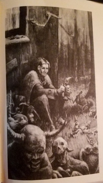 И, конечно, в этом он прав. Но все эти вещи, о которых он говорит, происходят из широкого и толстого корня традиционного литературного фэнтези — корня, который в наши дни проявляется в основном в виде фантастики ужасов. Современное коммерческое фэнтези, там, где оно вообще вырастает из традиционных литературных форм, произрастает почти исключительно из творчества Толкина. То, что Брайан сделал здесь, — это нечто очень интересное: он привил этот богатый, фантасмагорический, традиционный и мрачный материал к монохроматическому основанию современного жанра.