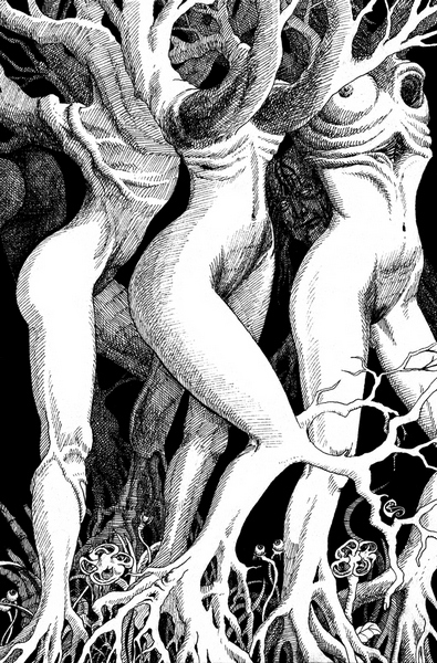 Когда я пришёл в себя, то удивился, почему рабы не защитили его. Казалось, они лежали мёртвыми или оглушёнными, но когда я осмотрел их, то обнаружил, что то, что я принял за упавших людей, было всего лишь кучами гниющей растительности. Я подхватил ребёнка и бросился бежать, не желая смотреть, как ветви хлещут и когтят лик луны. Выбегая из Беседки, я увидел, что деревья склоняются, словно собираясь поесть.