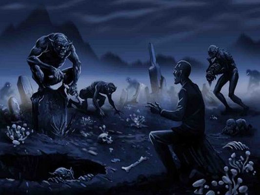 Кводомасс пристально смотрел на гробницу, но едва мог различить её обветшалые очертания в безлунной темноте. Ему показалось, что он заметил какое-то неясное мерцание за дверью; услышал что-то похожее на пронзительный смешок и его глухое эхо.