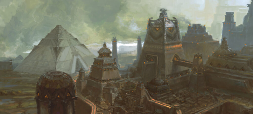 Гудение столпов перешло в пронзительный вой — и внезапно между ними вспыхнуло пламя. За долю секунды до того как он рефлекторно прикрыл глаза, Амран увидел детей в виде шести чёрных силуэтов, а за ними то, что казалось огромной огненной картиной странного мира — кипящие облака пламени, башни и аллеи из белого сверкающего хрусталя, движущиеся сущности, похожие на столбы огня. Свет хлынул в храм, на мгновение осветив каждую плиту и камень ослепительным сиянием.