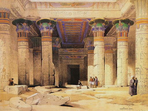 Он поманил торговца за собой, затем повёл его обратно в храм по узкой лестнице, пока они не добрались до другой, гораздо более широкой, затем снова вниз, и наконец оказались в коротком коридоре, который открывался в величественный неф с колоннами. Хотя на каждой колонне горело по факелу в креплениях, из-за его огромных размеров в помещении было темно. Здесь не было никаких идолов Мелькарта, но в южном конце большого зала стоял алтарь из тёмного камня между двумя толстыми, высокими, гладкими цилиндрическими столпами, а перед ними стоял молчаливый конклав лысых жрецов, закутанных как Маттан в чёрные одежды с откинутыми капюшонами, сбившимися комками на их шеях.