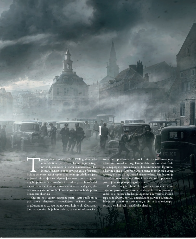 В октябре прошлого года во Франции вышла очередная книга Лавкрафта с роскошными иллюстрациями французского художника Франсуа Баранже — "Тень над Инсмутом". На мой взгляд (и не только на мой), эта повесть являются одним из лучших произведений мастера неописуемого ужаса. Интересно, как адаптирует историю Баранже? С предыдущими произведениями из серии — сложилась уже серия книг Лавкрафта и Баранже — художник справился здорово. Масштабные, детализированные и визуально холодные пейзажи заставляют человека чувствовать себя песчинкой в руках Древних богов, как и задумывалось Г. Ф. Л. Фактически это арт-буки, художественные альбомы, дополненные текстом Лавкрафта.