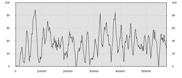 (по горизонтали: счётчик знаков; по вертикали: процент диалогов; размер скользящего окна: знаков, шаг: 1000 знаков) |