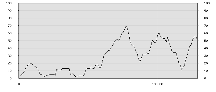 (по горизонтали: счётчик знаков; по вертикали: процент диалогов; размер скользящего окна: знаков, шаг: 1000 знаков) |