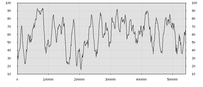 (по горизонтали: счётчик знаков; по вертикали: процент диалогов; размер скользящего окна: знаков, шаг: 1000 знаков) |
