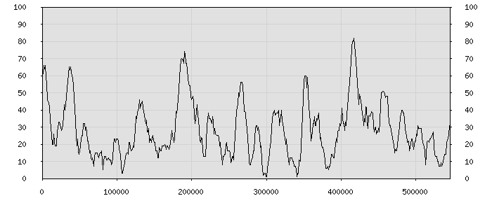(по горизонтали: счётчик знаков; по вертикали: процент диалогов; размер скользящего окна: знаков, шаг: 1000 знаков) |