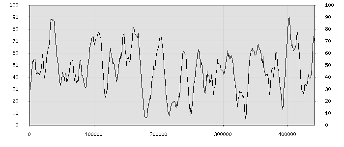 (по горизонтали: счётчик знаков; по вертикали: процент диалогов; размер скользящего окна: знаков, шаг: 1000 знаков) |