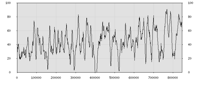 (по горизонтали: счётчик знаков; по вертикали: процент диалогов; размер скользящего окна: знаков, шаг: 1000 знаков) |