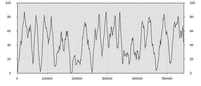 (по горизонтали: счётчик знаков; по вертикали: процент диалогов; размер скользящего окна: знаков, шаг: 1000 знаков) |