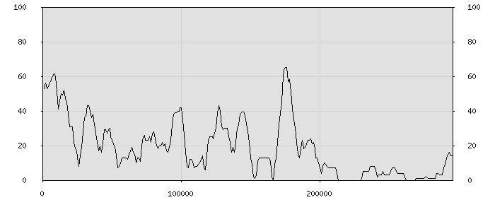 (по горизонтали: счётчик знаков; по вертикали: процент диалогов; размер скользящего окна: знаков, шаг: 1000 знаков) |