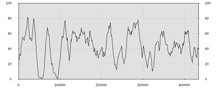 (по горизонтали: счётчик знаков; по вертикали: процент диалогов; размер скользящего окна: знаков, шаг: 1000 знаков) |