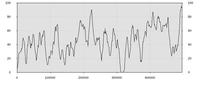 (по горизонтали: счётчик знаков; по вертикали: процент диалогов; размер скользящего окна: знаков, шаг: 1000 знаков) |