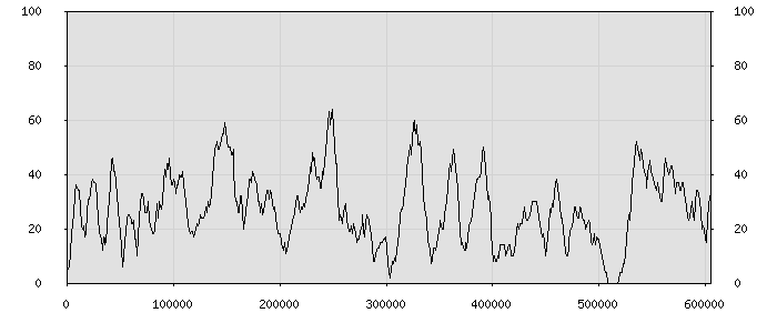 (по горизонтали: счётчик знаков; по вертикали: процент диалогов; размер скользящего окна: знаков, шаг: 1000 знаков) |