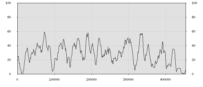 (по горизонтали: счётчик знаков; по вертикали: процент диалогов; размер скользящего окна: знаков, шаг: 1000 знаков) |