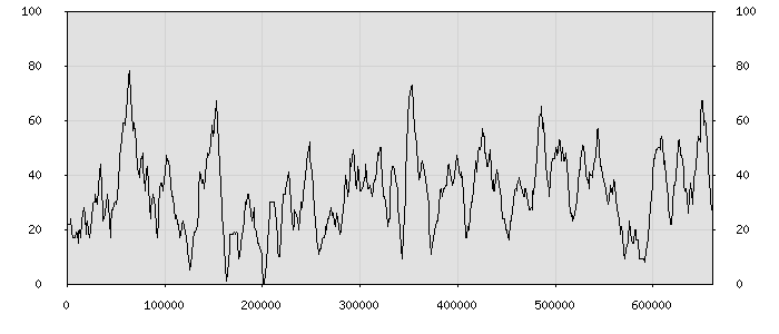 (по горизонтали: счётчик знаков; по вертикали: процент диалогов; размер скользящего окна: знаков, шаг: 1000 знаков) |