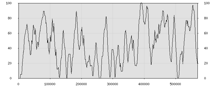(по горизонтали: счётчик знаков; по вертикали: процент диалогов; размер скользящего окна: знаков, шаг: 1000 знаков) |
