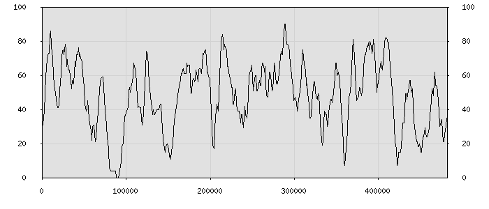(по горизонтали: счётчик знаков; по вертикали: процент диалогов; размер скользящего окна: знаков, шаг: 1000 знаков) |