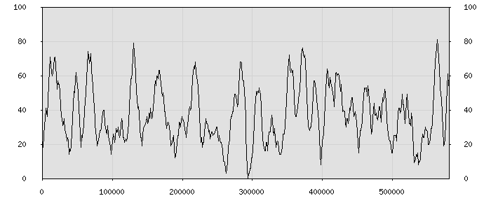(по горизонтали: счётчик знаков; по вертикали: процент диалогов; размер скользящего окна: знаков, шаг: 1000 знаков) |
