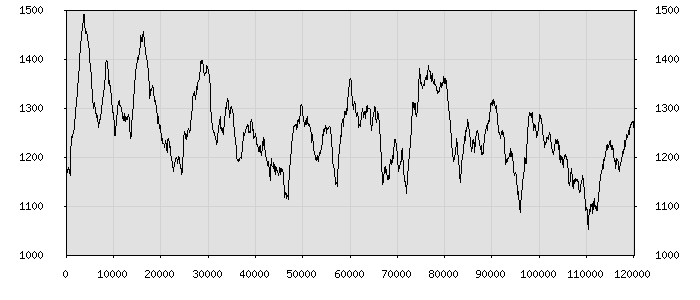 (по горизонтали: счётчик знаков; по вертикали: процент диалогов; размер скользящего окна: знаков, шаг: 1000 знаков) |