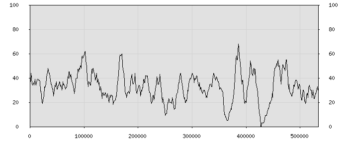 (по горизонтали: счётчик знаков; по вертикали: процент диалогов; размер скользящего окна: знаков, шаг: 1000 знаков) |