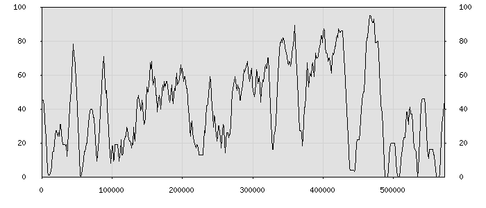 (по горизонтали: счётчик знаков; по вертикали: процент диалогов; размер скользящего окна: знаков, шаг: 1000 знаков) |