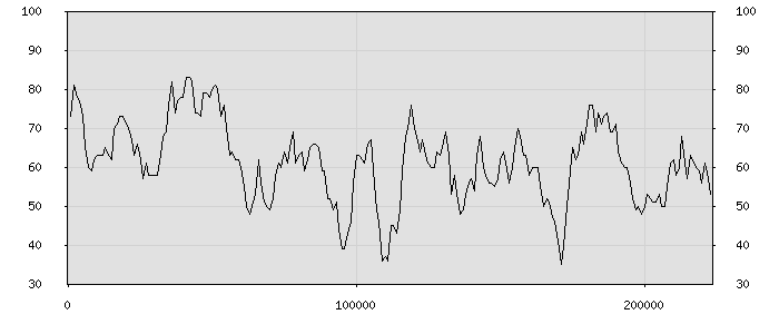 (по горизонтали: счётчик знаков; по вертикали: процент диалогов; размер скользящего окна: знаков, шаг: 1000 знаков) |