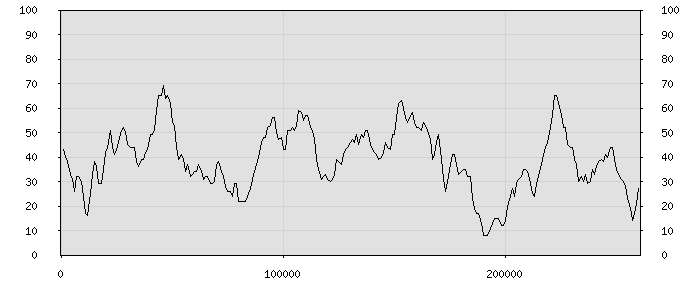 (по горизонтали: счётчик знаков; по вертикали: процент диалогов; размер скользящего окна: знаков, шаг: 1000 знаков) |