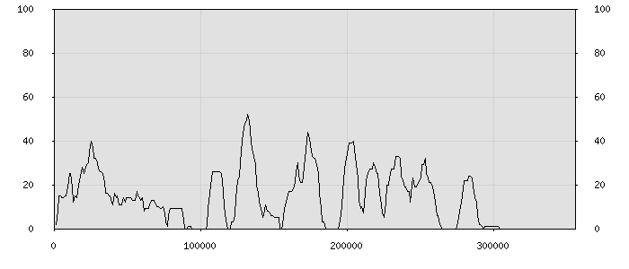 (по горизонтали: счётчик знаков; по вертикали: процент диалогов; размер скользящего окна: знаков, шаг: 1000 знаков) |