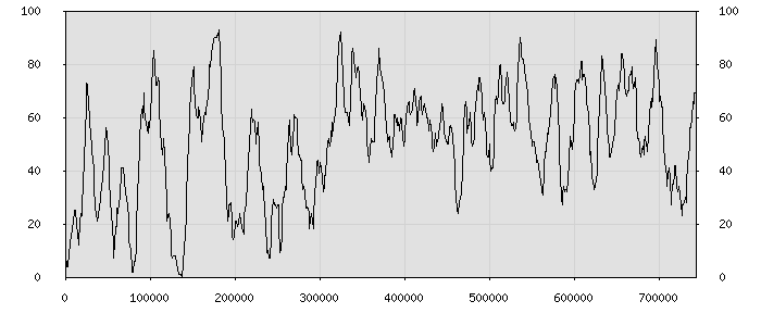 (по горизонтали: счётчик знаков; по вертикали: процент диалогов; размер скользящего окна: знаков, шаг: 1000 знаков) |