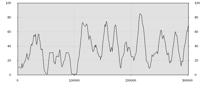 (по горизонтали: счётчик знаков; по вертикали: процент диалогов; размер скользящего окна: знаков, шаг: 1000 знаков) |