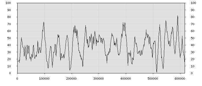 (по горизонтали: счётчик знаков; по вертикали: процент диалогов; размер скользящего окна: знаков, шаг: 1000 знаков) |