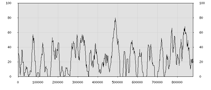 (по горизонтали: счётчик знаков; по вертикали: процент диалогов; размер скользящего окна: знаков, шаг: 1000 знаков) |