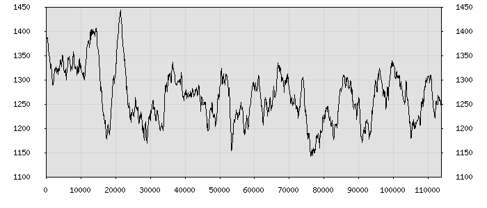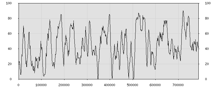 (по горизонтали: счётчик знаков; по вертикали: процент диалогов; размер скользящего окна: знаков, шаг: 1000 знаков) |