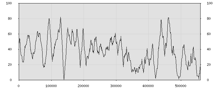 (по горизонтали: счётчик знаков; по вертикали: процент диалогов; размер скользящего окна: знаков, шаг: 1000 знаков) |