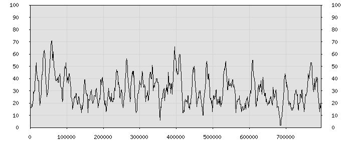 (по горизонтали: счётчик знаков; по вертикали: процент диалогов; размер скользящего окна: знаков, шаг: 1000 знаков) |