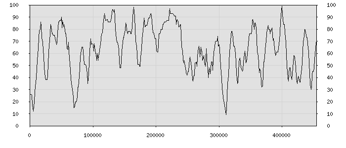 (по горизонтали: счётчик знаков; по вертикали: процент диалогов; размер скользящего окна: знаков, шаг: 1000 знаков) |