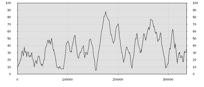 (по горизонтали: счётчик знаков; по вертикали: процент диалогов; размер скользящего окна: знаков, шаг: 1000 знаков) |